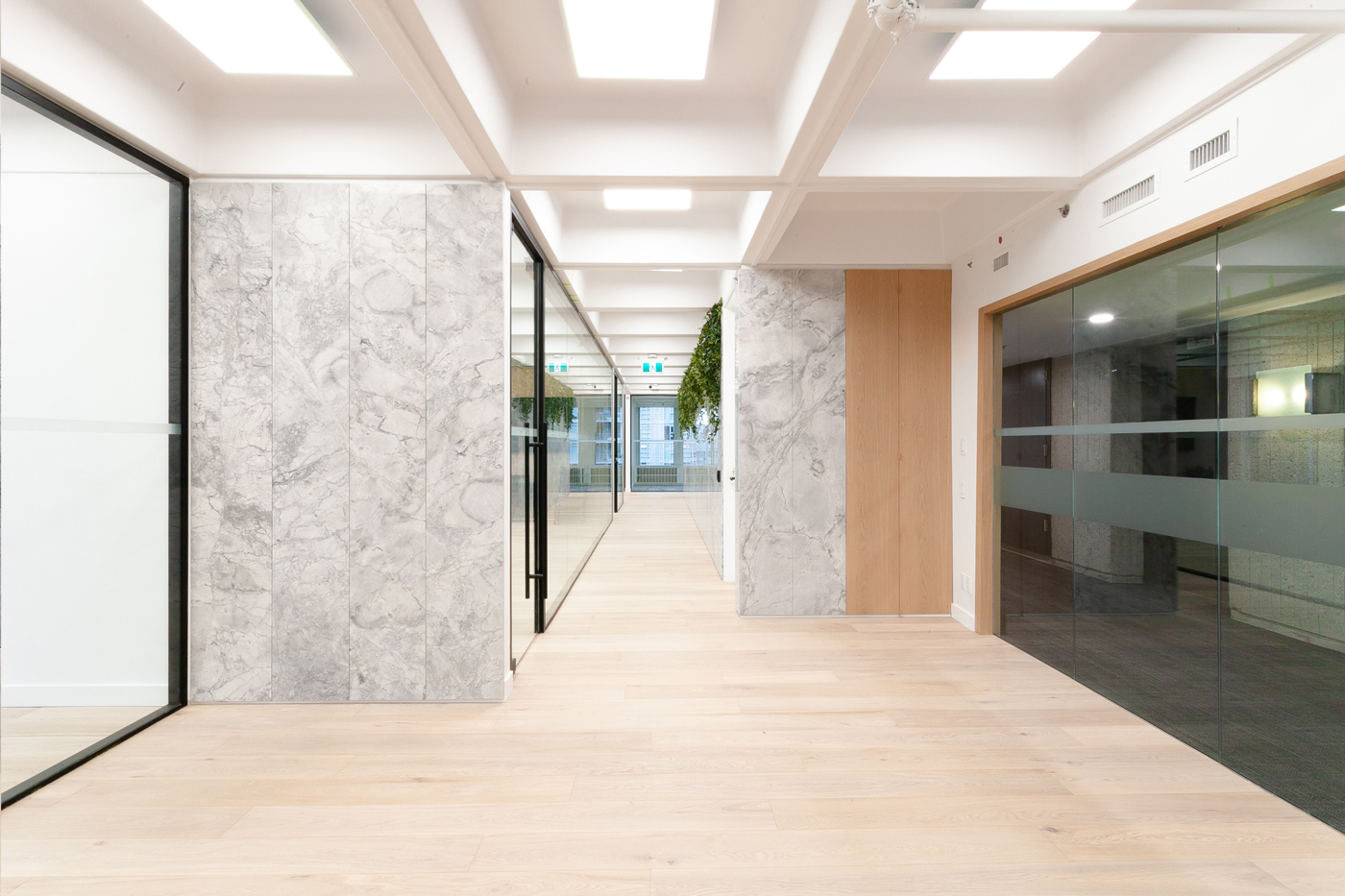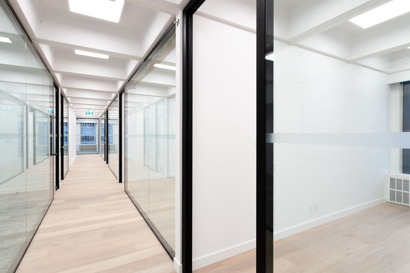 We demolished the existing layout and created 20 individual offices, 3 board meeting rooms, a print room, kitchen, IT room and storage space. High-quality hardwood floors, carpet tiles, and custom millwork added to an elegant and timeless workspace.