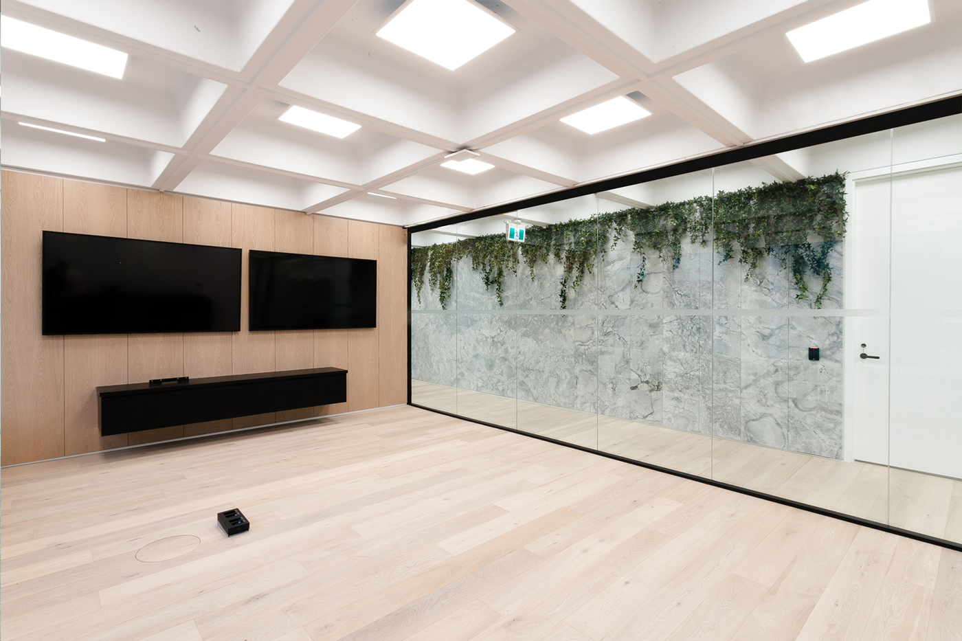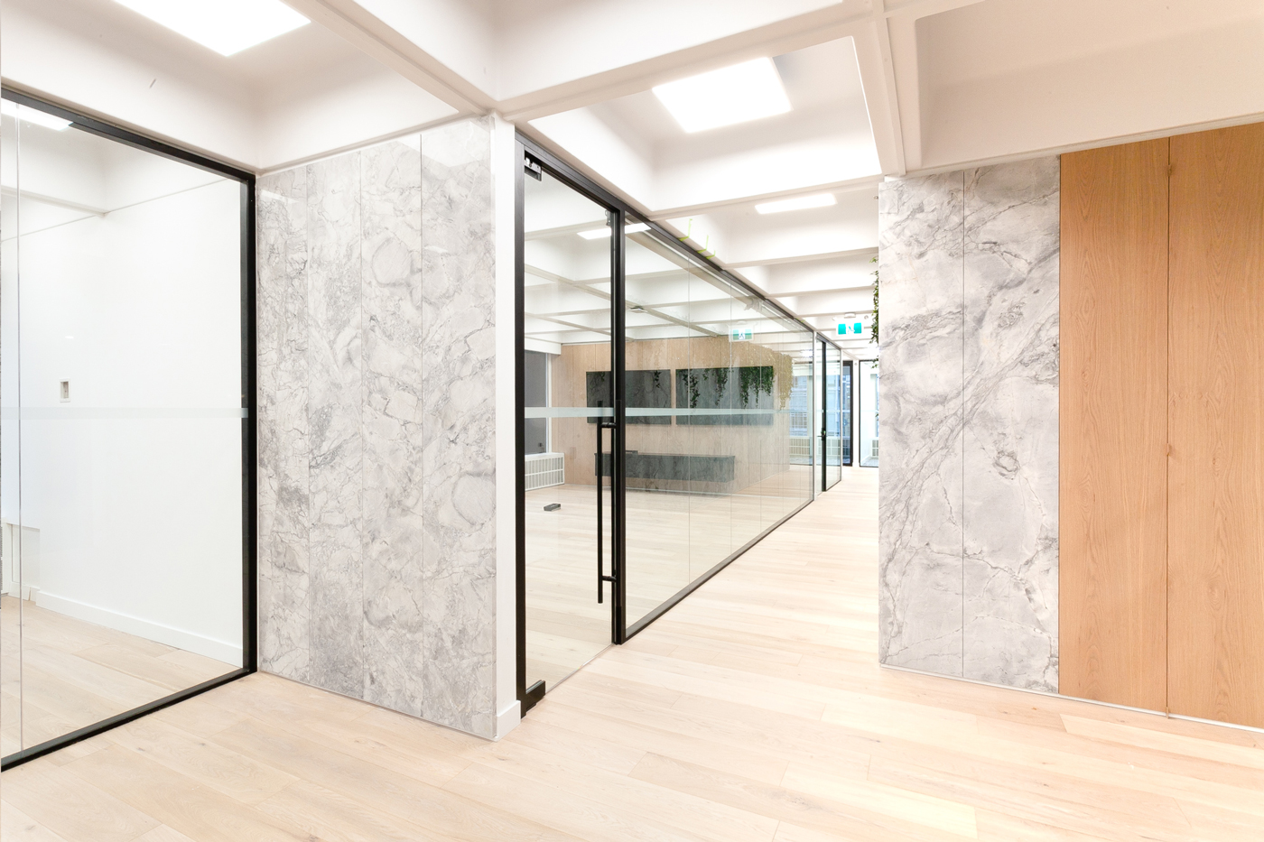 Working closely with the client and designer, we transformed the old office into a new custom build-out. The design intent of the space was to bring an energetic workplace culture, using modern elements and combining different materials to create the overall feel. The front of the house welcomes you from the minute you walk into the suite with an elegant stone reception desk, feature stone and wood wall panels, and floor to ceiling glazing creating a spacious and clean space.