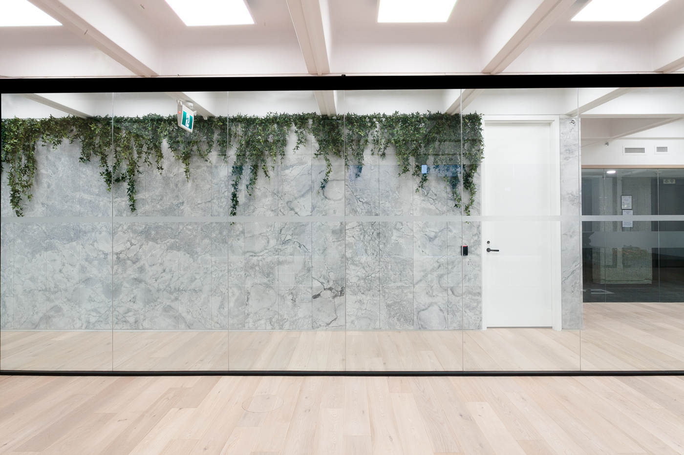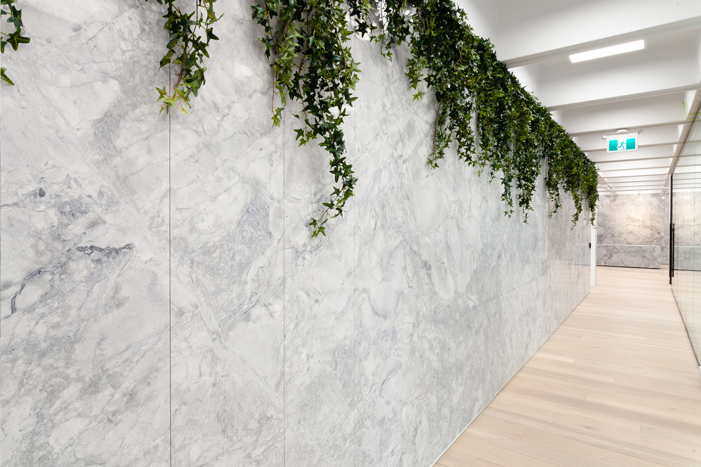 A focal point of the workspace. A 36 ft feature wall, 33 stone panels (Kryptonite Stoneworks) with an integrated greenery design intent towards the top to create movement and a cascading effect.